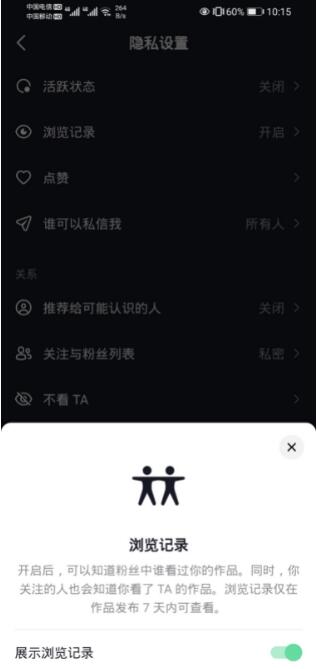 点击“隐私设置”之后,会看到浏览记录,点绿这个按钮,您的浏览记录就打开了,就可以看到朋友的谁浏览了您,同时还能够看到抖音给出的提示。
