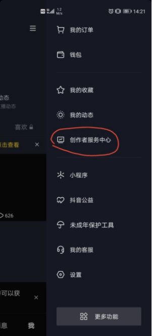 点开刚刚三条横线的选项后来到了一个新页面,可以看到这个页面第五个项。有一个“创作者服务中心”,选中这项并点击。